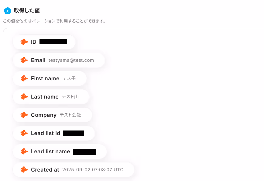 必要な設定ができたら「テスト」ボタンを押してみましょう。取得した値に、Loopsで作成されたコンタクトのIDが表示されていれば成功です!