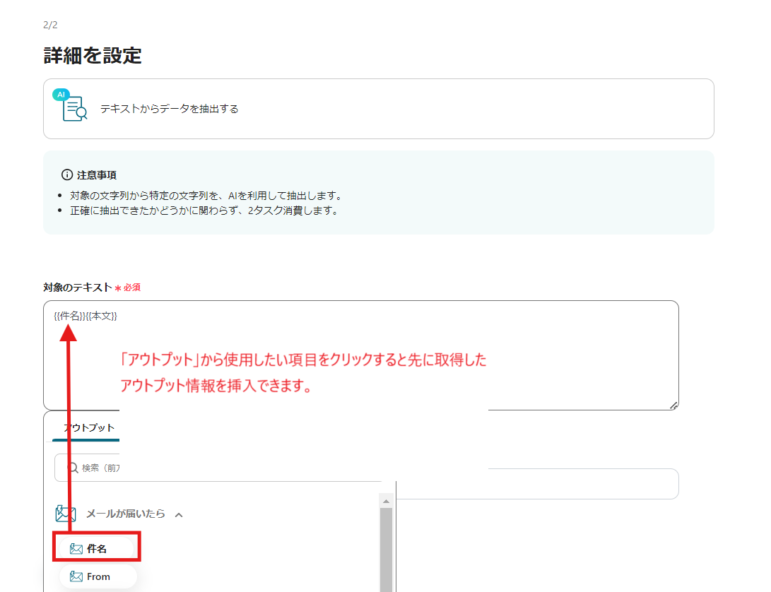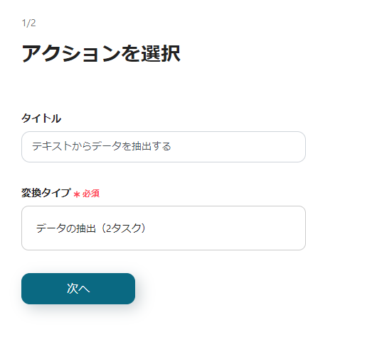 2)アクションは「テキストからデータを抽出する」にし、変換タイプは「データの抽出(2タスク)」を選択して、「次へ」をクリックします。