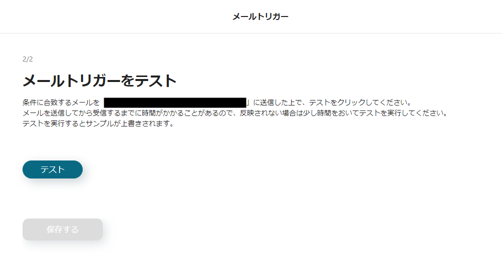 2)条件に合致するメールを先ほど設定したアドレスに送信した上で、テストをクリックしてください。