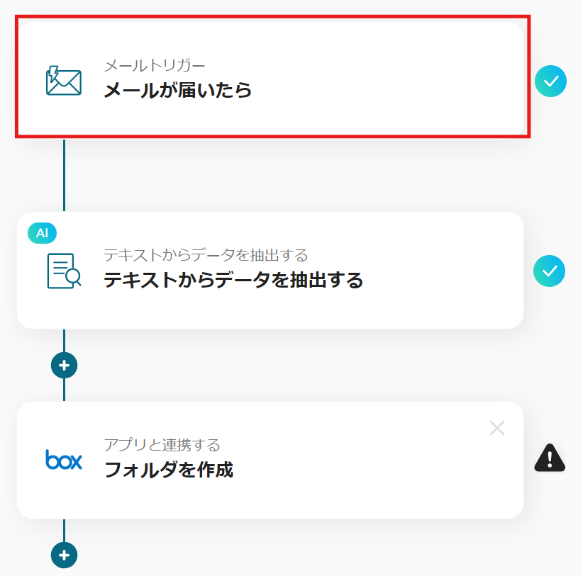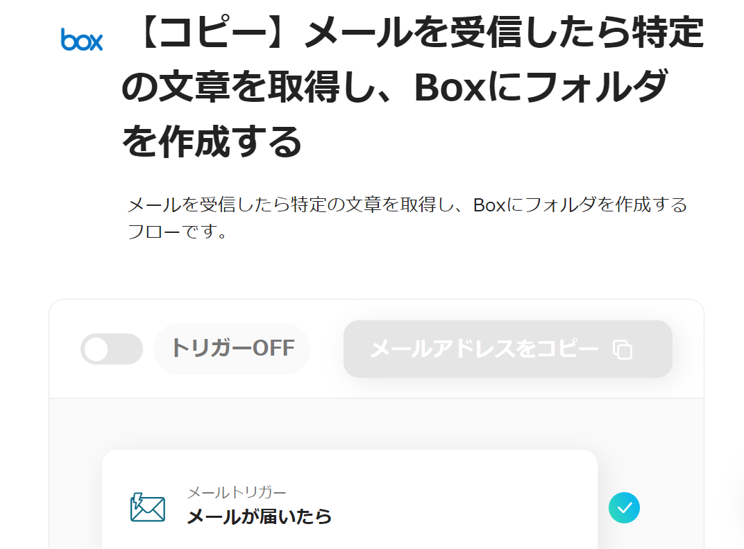 これで【メールを受信したら特定の文章を取得し、Boxにフォルダを作成する】というフローの完成です。