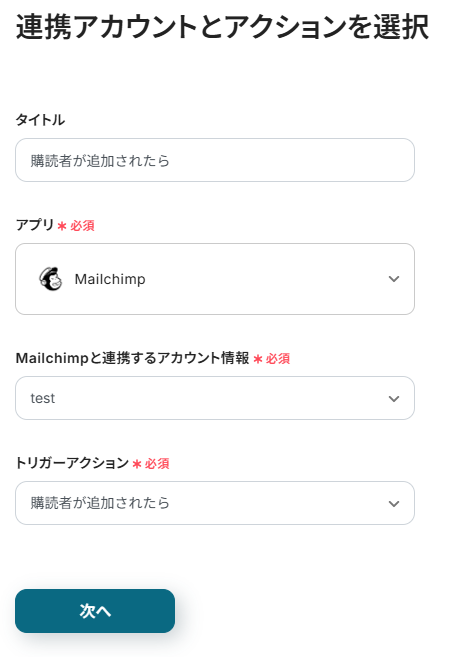 タイトルと連携するアカウント情報を任意で設定し、トリガーアクションはテンプレート通りに「購読者が追加されたら」のまま「次へ」をクリックして進んでください。