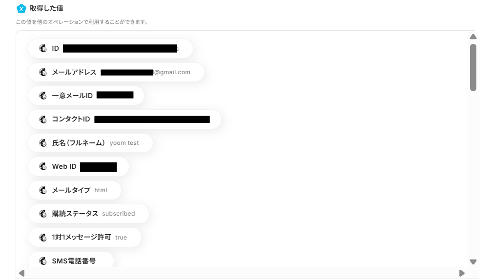 テストが成功した場合は、アウトプットが取得できます。こちらの値は次の設定に活用するので、取得された内容を確認して保存しましょう。