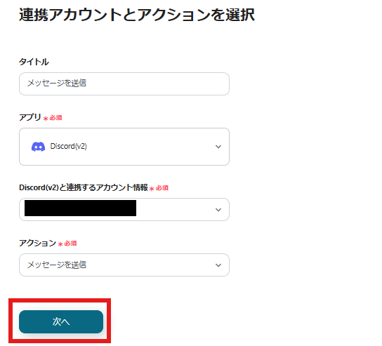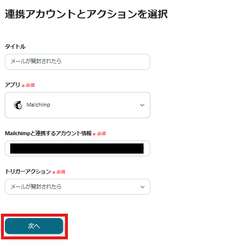 「連携アカウントとアクションを選択」という画面が表示されるので、「次へ」をクリックしましょう。