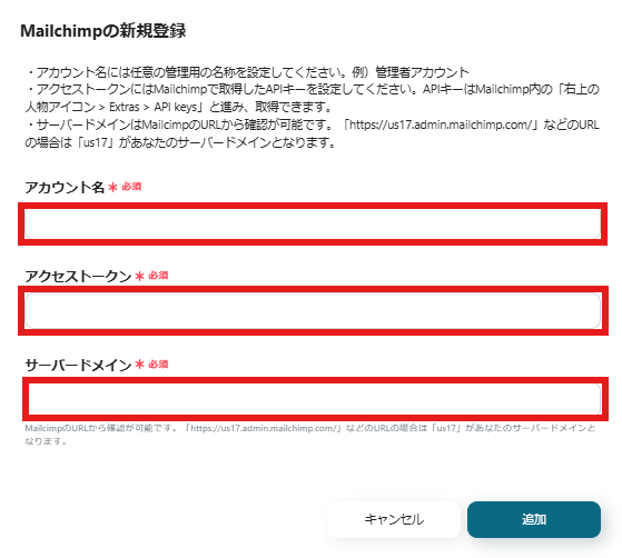 Mailchimpのアカウント情報を入力する画面が表示されます。