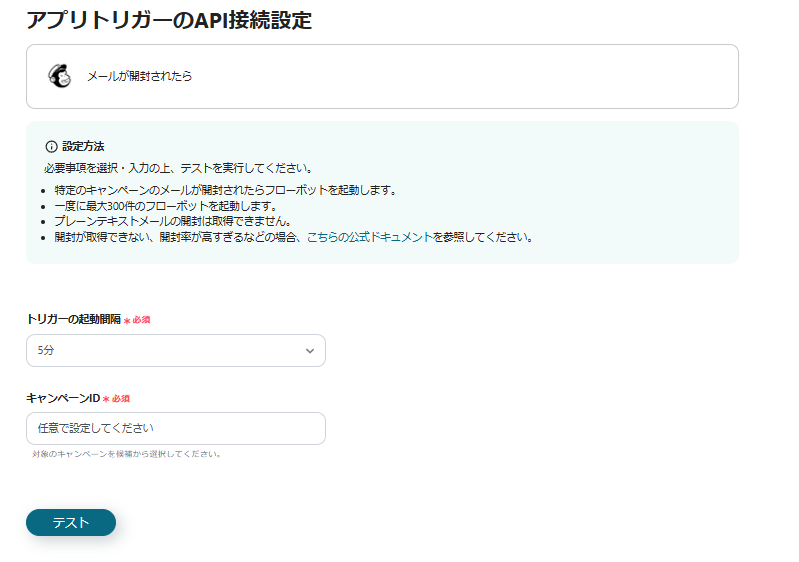 こちらのページを設定することで、特定のキャンペーンのメールが開封されたらフローボットを起動します。