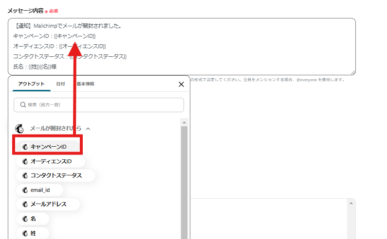 メッセージ内容をクリックすると「アウトプット」が表示されます。