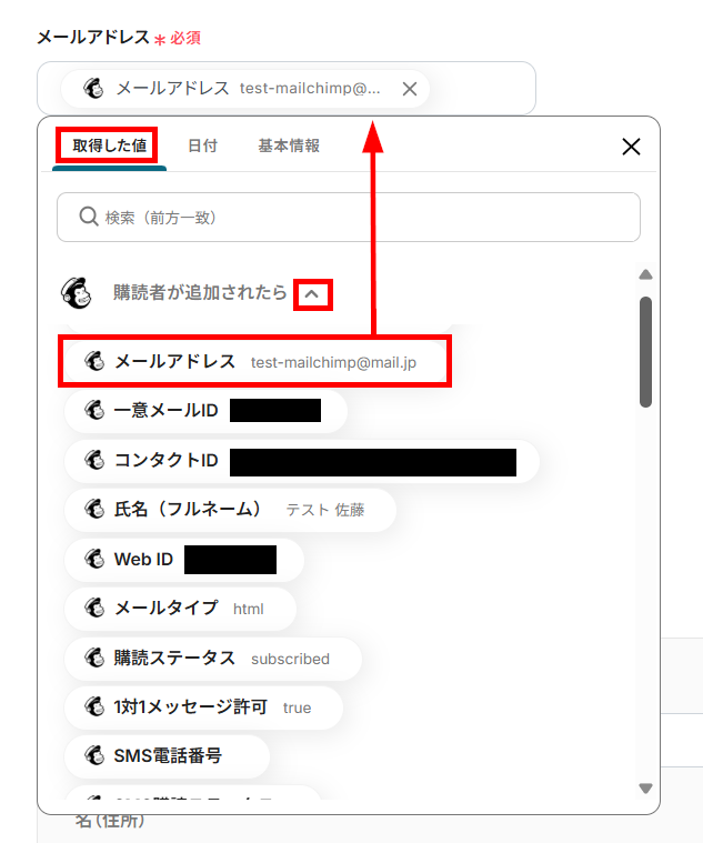テストが成功すると、取得した値に購読者の情報が表示されるので、確認して保存します。