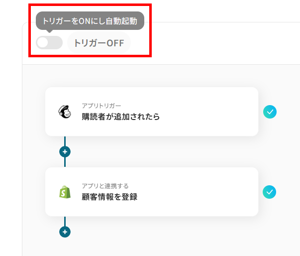 このワークフローを利用することで、Mailchimpに新しい購読者が追加された際に、その情報を自動でShopifyの顧客情報として登録できます。