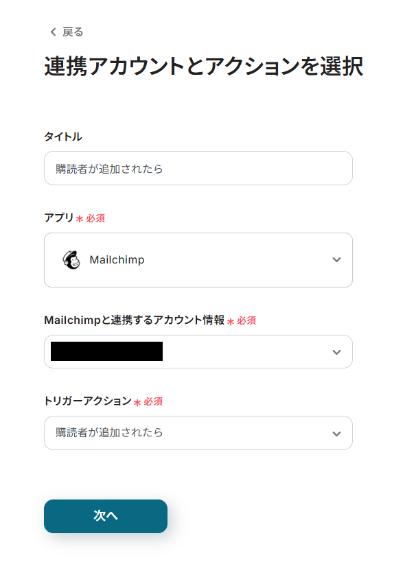 ここでは、Mailchimpで購読者が追加されたらフローボットが起動するように設定を行います。