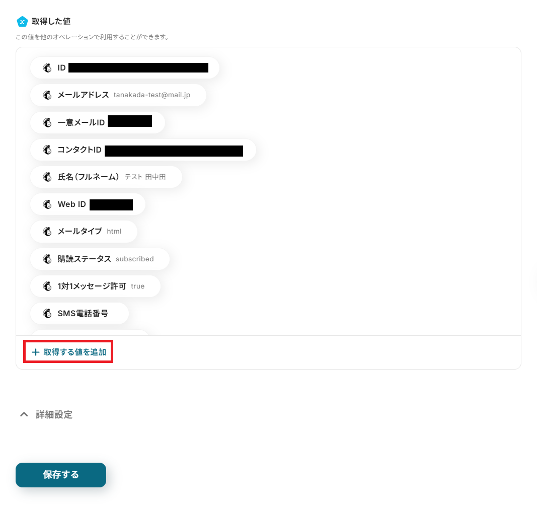 テストが成功すると、取得した値=アウトプットに購読者の情報が表示されるので、確認して保存します。