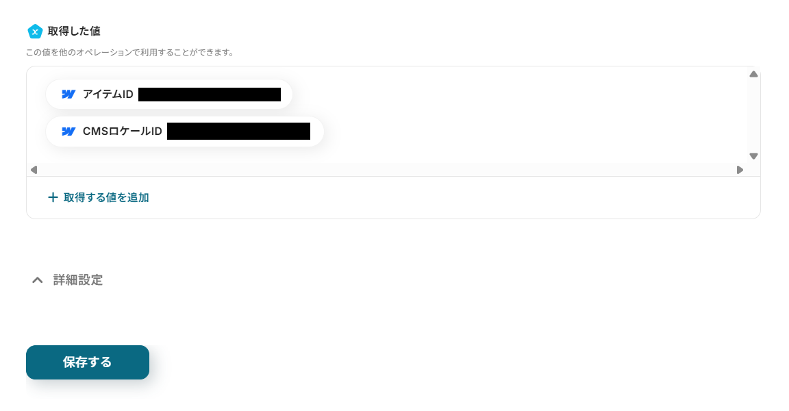 アウトプットは各アクションで取得でき、取得したアウトプットはそれ以降のアクションで活用可能です。つまり、ここで取得したアウトプットをWebflowに自動登録可能となります!取得した値(アウトプット)について詳しくはこちら