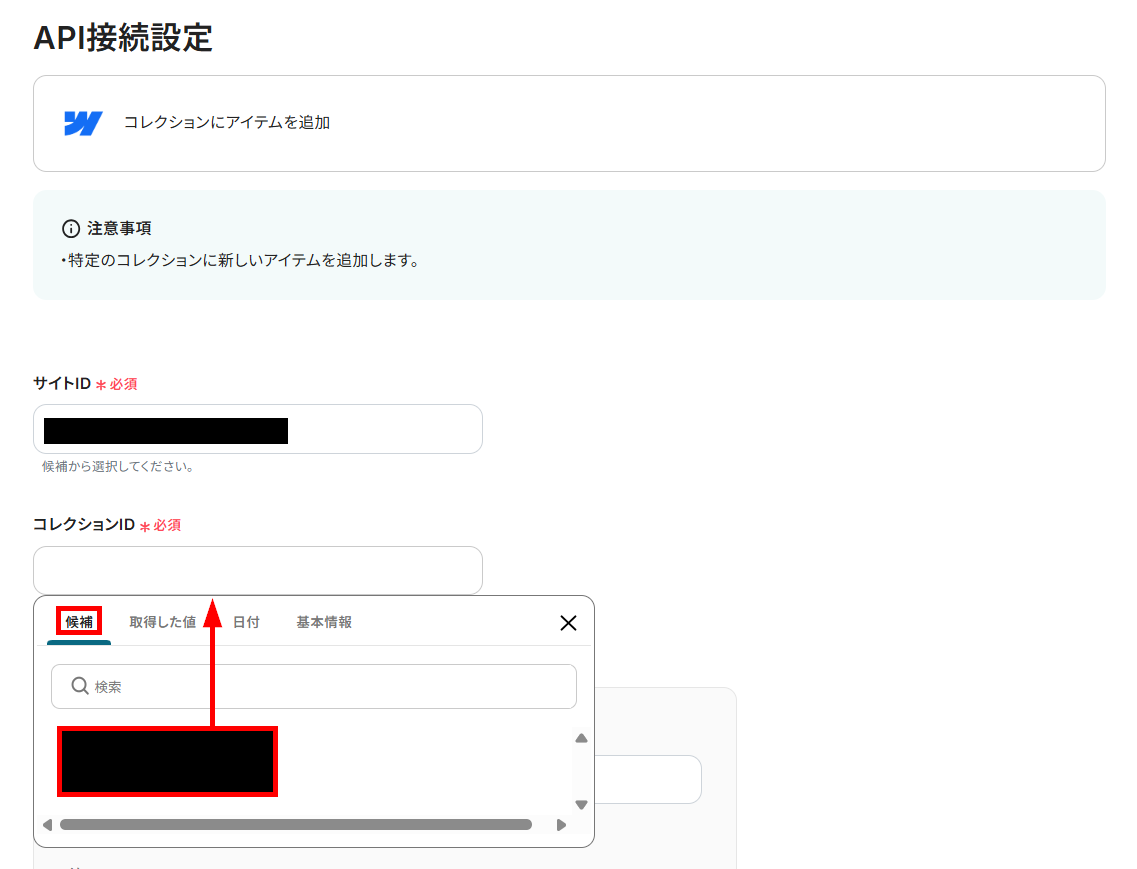 次に、Mailchimpから取得した値を利用して、Webflowにアイテムを追加する設定を行います。