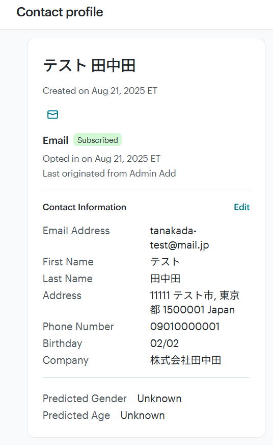 カスタムフィールドを連携する場合は、Mailchimpの設定でテストが終了したら、取得した値に追加してください。