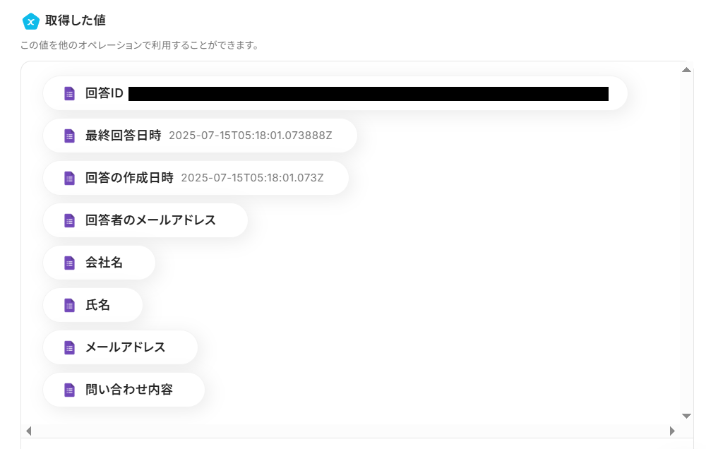 テストに成功していると、回答者IDやメールアドレスなどといった情報が、以下のように「取得した値」として表示されます。