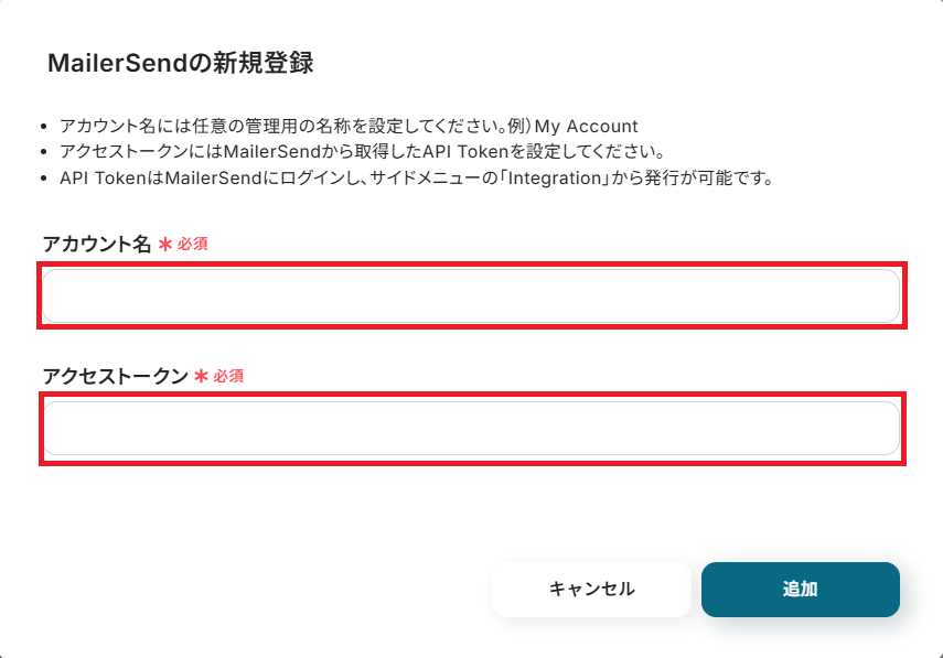 アカウント名はMailerSendに登録しているメールアドレスなどでOKですが、アクセストークンは一度Yoomから離れ、MailerSendにログインしてから自分で取得する必要があります。