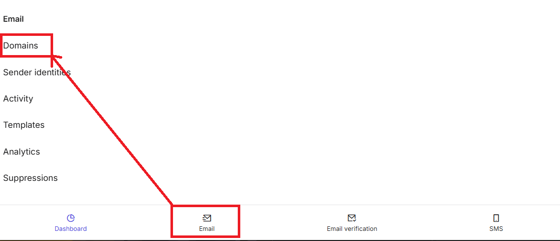 MailerSendにログインし、以下のような画面から「Email」をクリックしてから「Domains」に進みましょう。