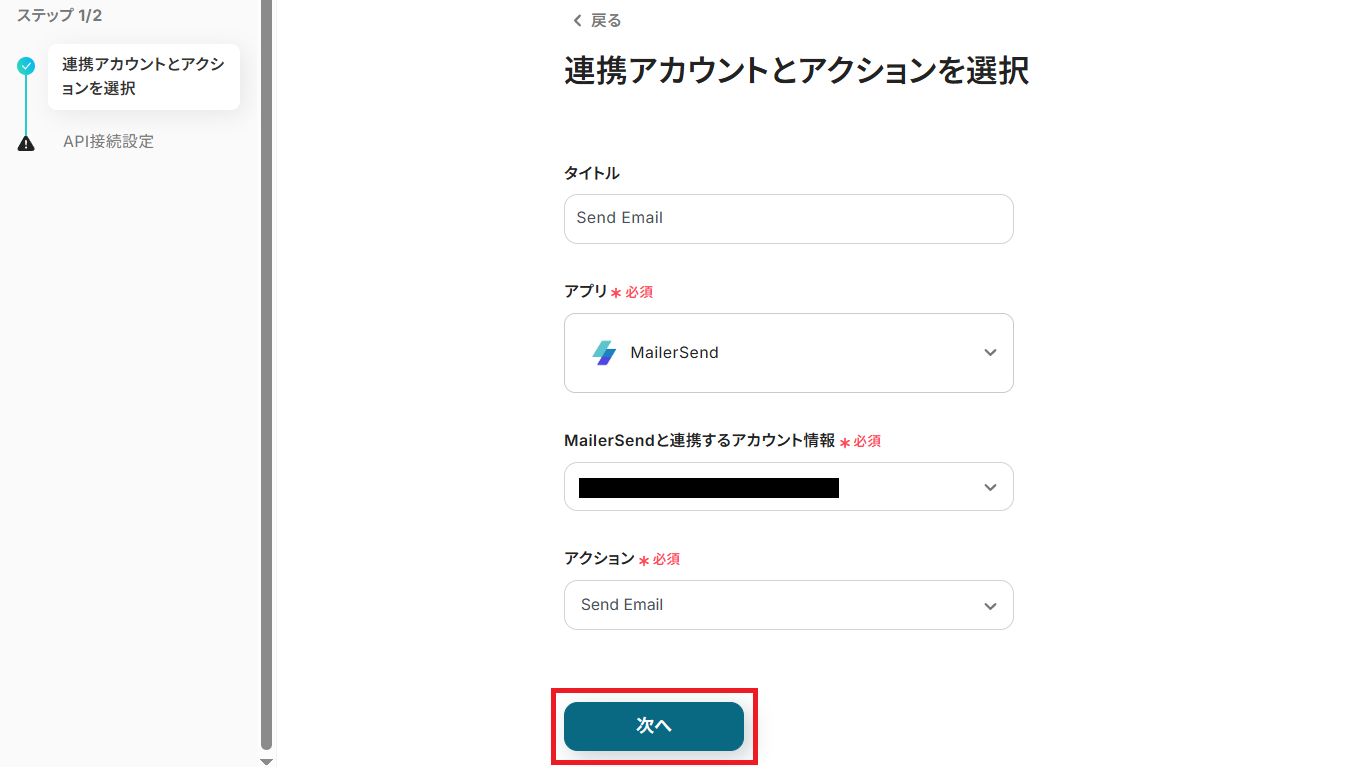 タイトルは任意で変更し、MailerSendと連携するアカウントが間違っていないかを確かめてください。
