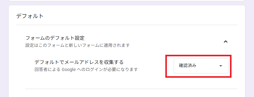 回答者からのメールアドレスを集めるために、Googleフォームの設定画面で「デフォルトでメールアドレスを収集する」のプルダウンを「確認済み」に設定しておきましょう。