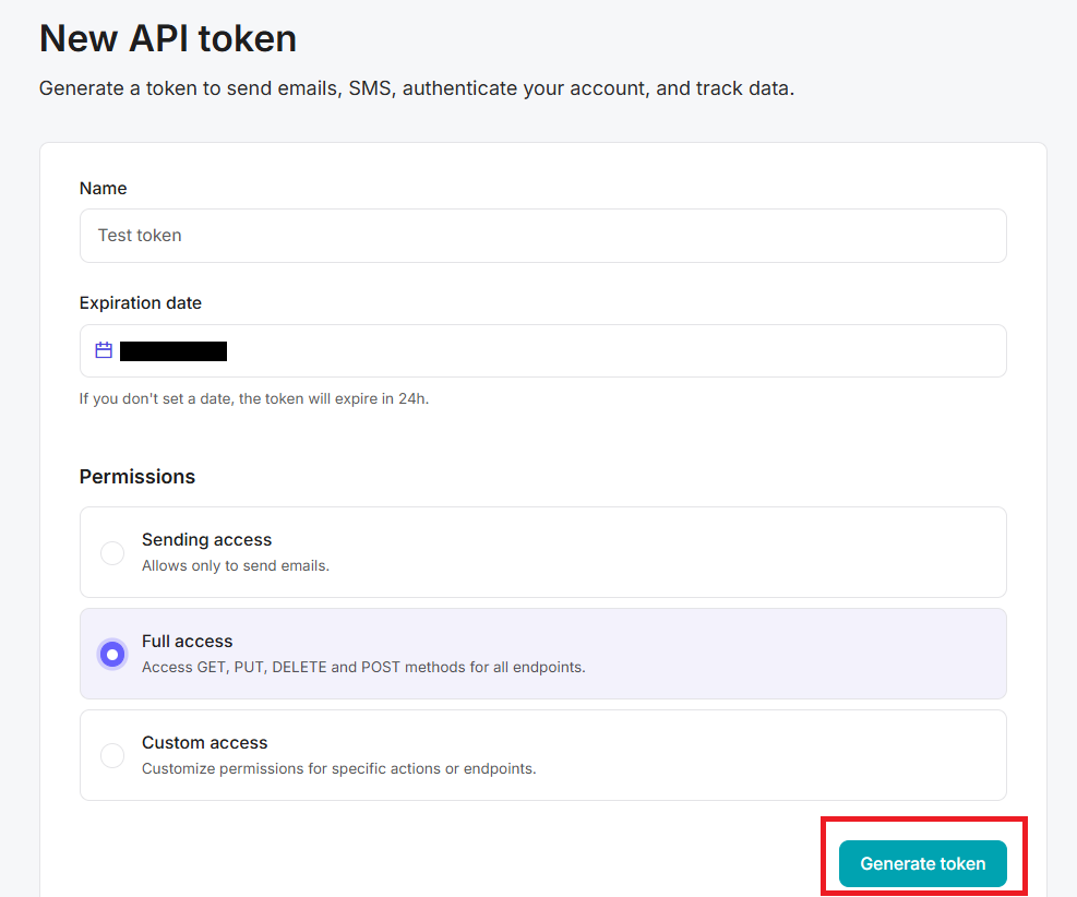 トークンの名前や有効な日付などを設定する画面を確認して、右下の「Generate token」をクリックしてください。