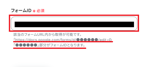 「フォームID」と書かれているブロックの下にあるように、Googleフォーム作成画面のURLからフォームIDを抽出して入力しましょう。