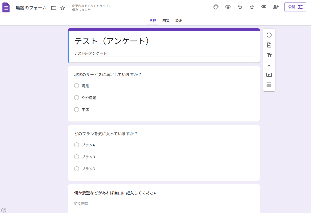 次に、対象となるGoogleフォームのIDを入力します。ここではあらかじめ、テスト用に以下のようなGoogleフォームのアンケートを作っておきましょう。