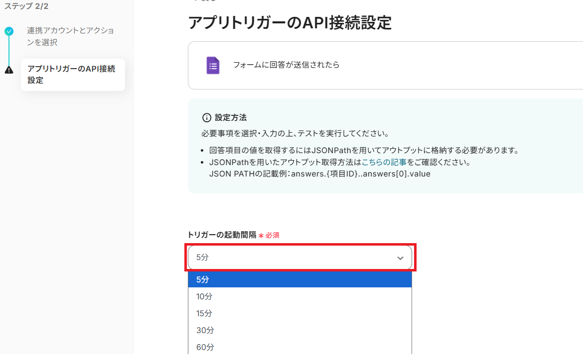 次に、トリガーの起動間隔を設定します。ボックスをクリックすると、プルダウンで好きな起動間隔を選べます。