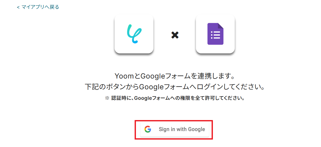 ログインすると、Googleフォームの情報に対するYoomの権限を確認する画面が出てきます。全てにチェックを入れ、「続行」ボタンを押してください。