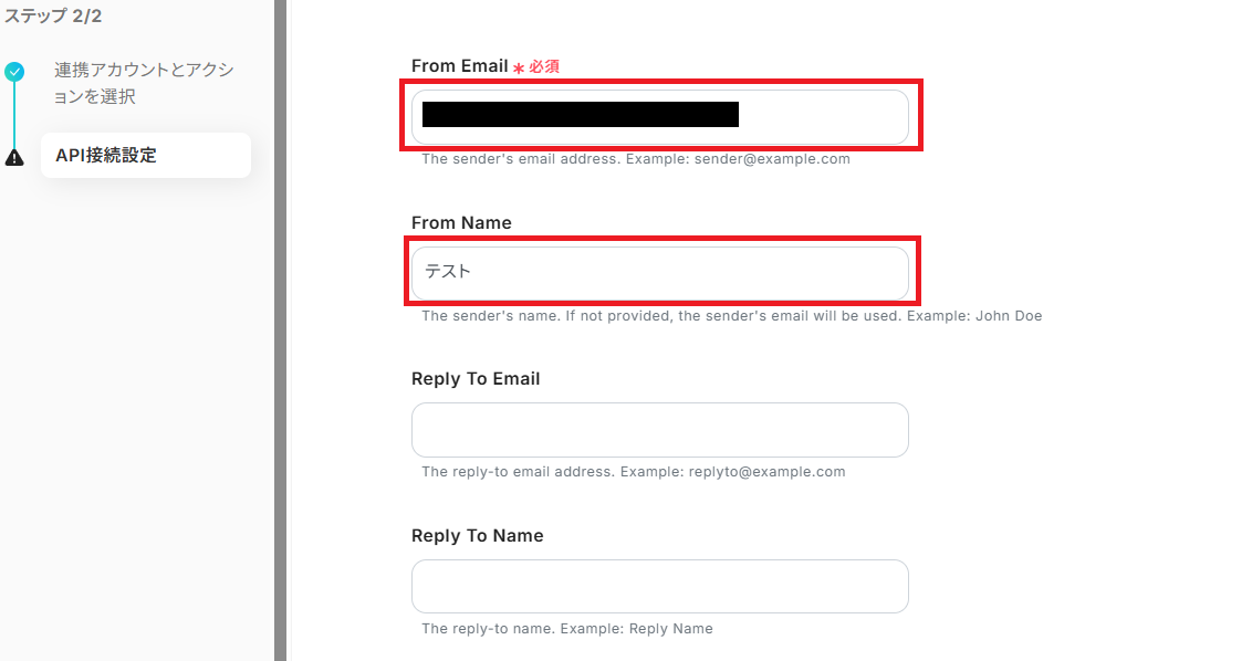 「From Email」は必須項目です。Mailersendで作ってある独自ドメインからメールアドレスをコピーして貼り付けましょう。