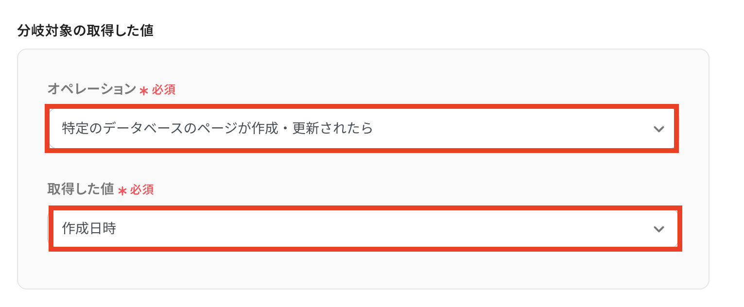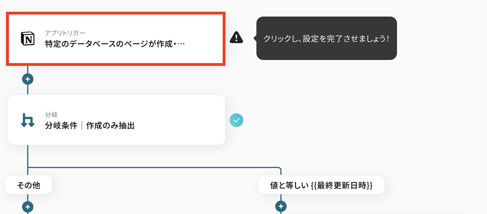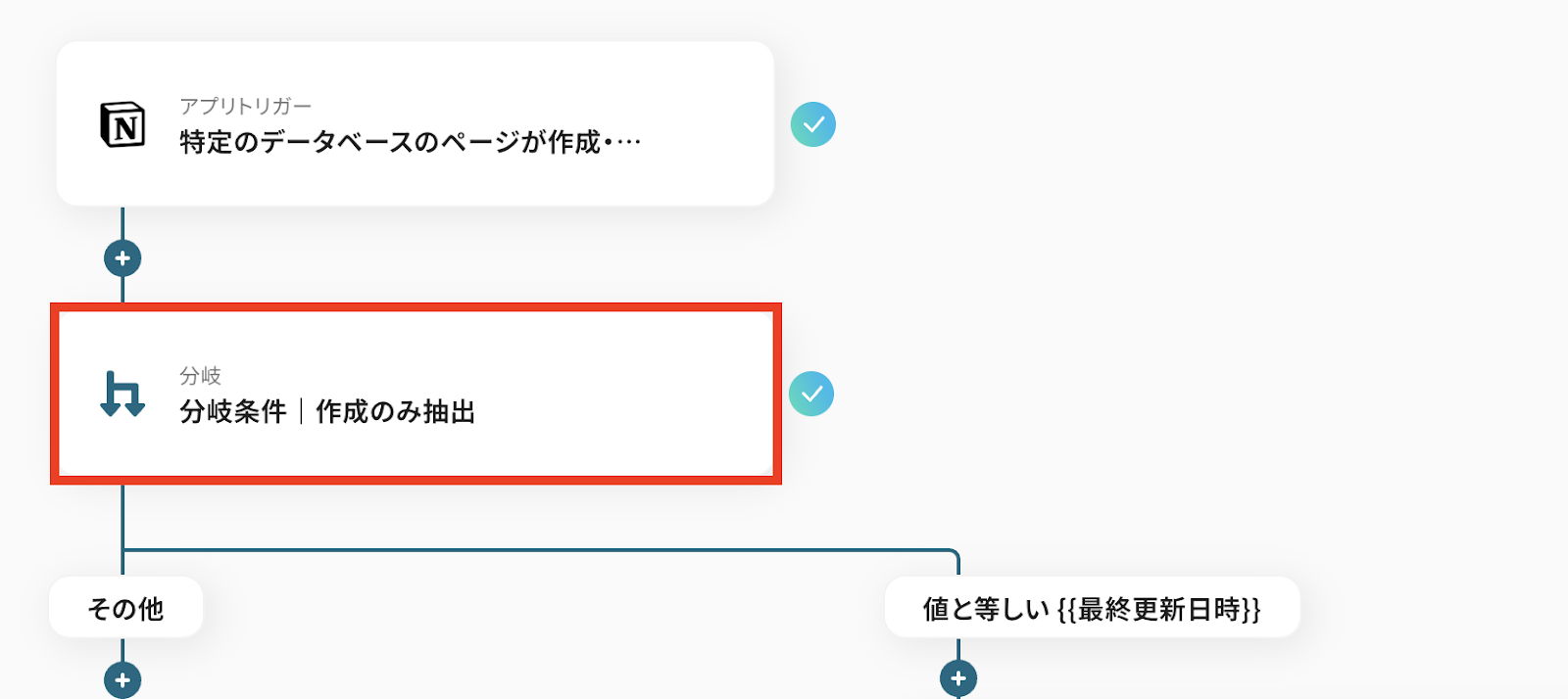 ここでは、分岐の設定を行います! テンプレートのタイトルにもあるように「Notionの特定のページが作成された場合のみ(更新は含まない)」ための設定です。