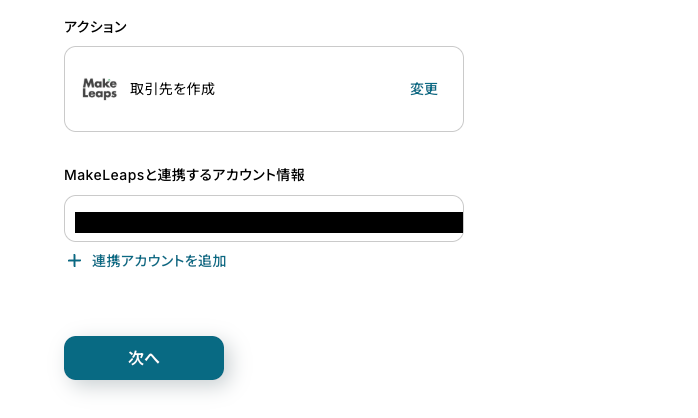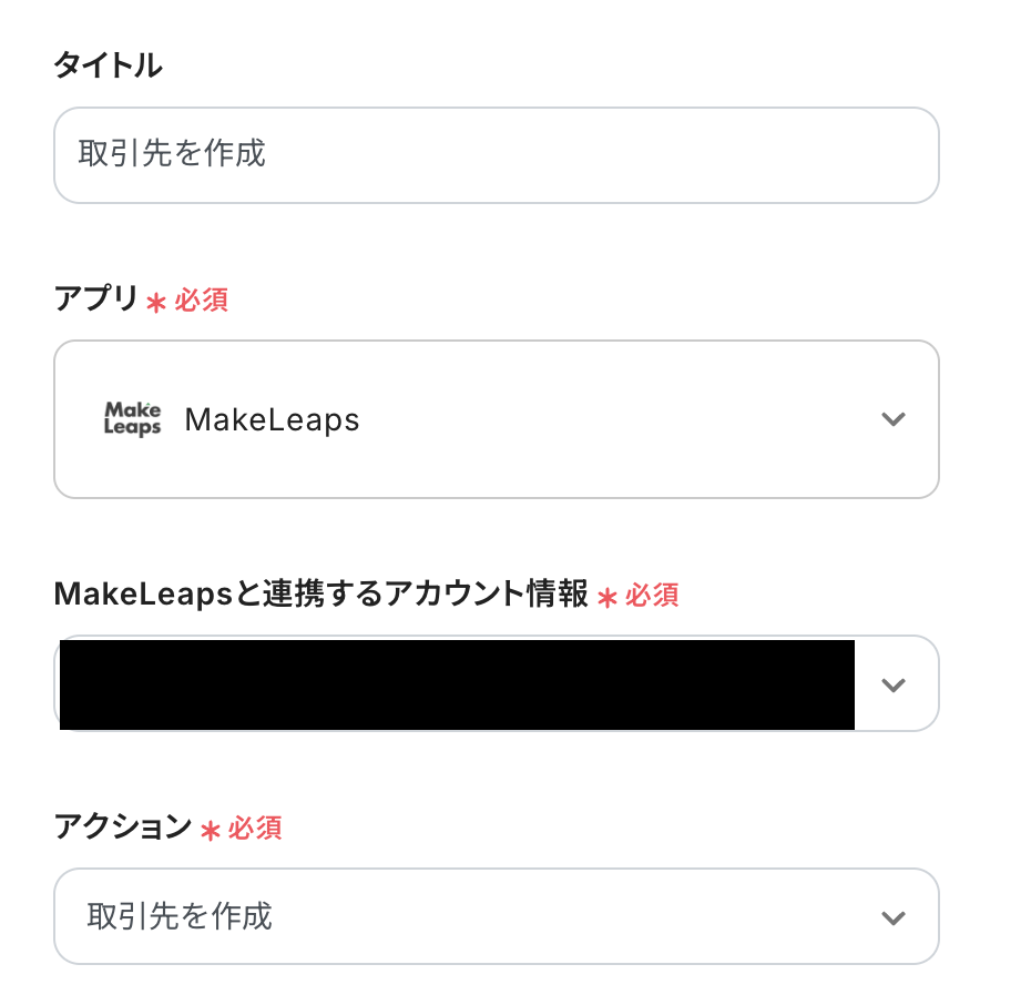 先ほどと同様に必要箇所を入力していきます。 「タイトル」:必要に応じて変更可能 「MakeLeapsと連携するアカウント情報」:合っているか確認 「アクション」:「取引先を作成」を選択