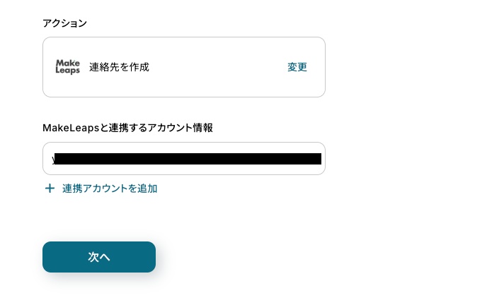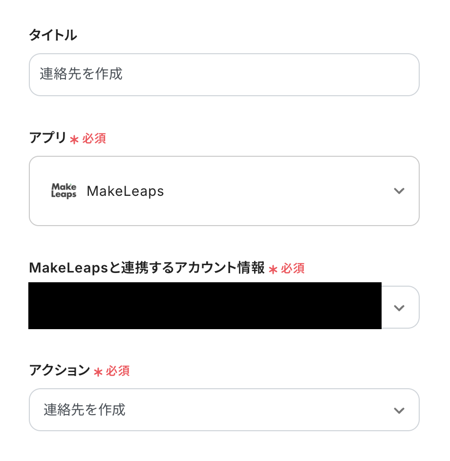 必要箇所を入力していきます。 「タイトル」:必要に応じて変更可能 「MakeLeapsと連携するアカウント情報」:合っているか確認 「アクション」:「連絡先を作成」を選択