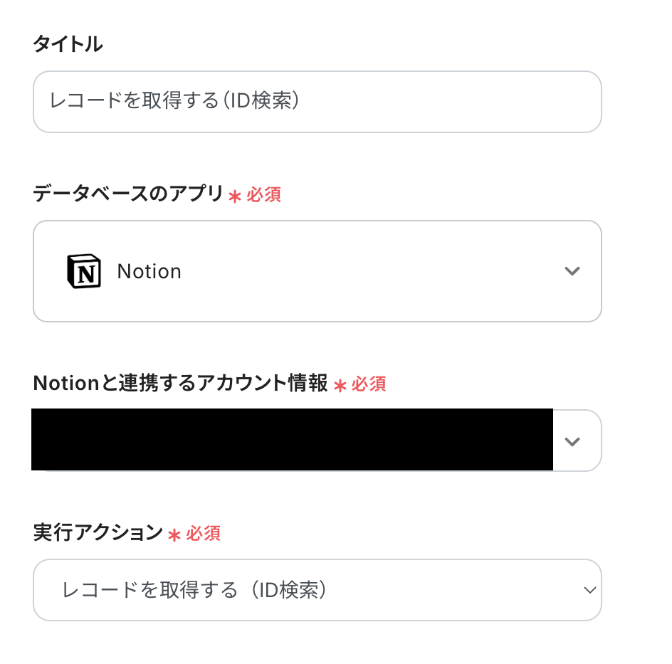 必要箇所を入力していきます。 「タイトル」:必要に応じて変更可能 「Notionと連携するアカウント情報」:合っているか確認 「実行アクション」:「レコードを取得する(ID検索)」を選択