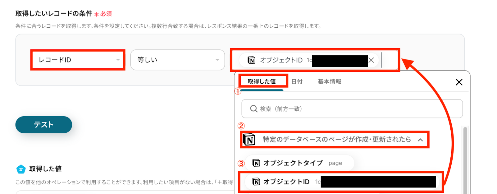 入力が完了したら「テスト」を押します。 テストに成功すると「取得した値」としてNotionのデータがアウトプットされるので「保存する」をクリックします。