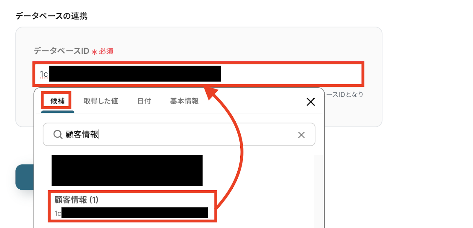 次にデータベースの連携をしていきます。 ステップ3と同じ「データベース(データソース)ID」を入力しますが、今回は候補から選択可能です。 入力欄をクリックして候補一覧から選びましょう! (検索窓を使うと簡単に候補一覧から該当のページを選べますよ。)