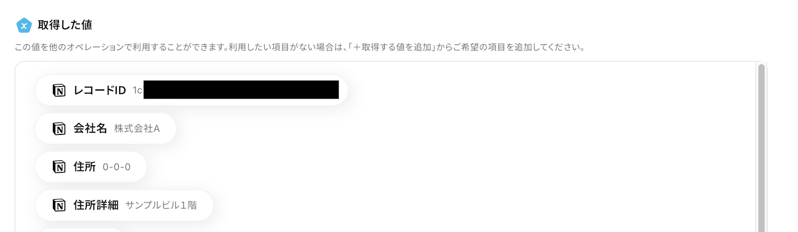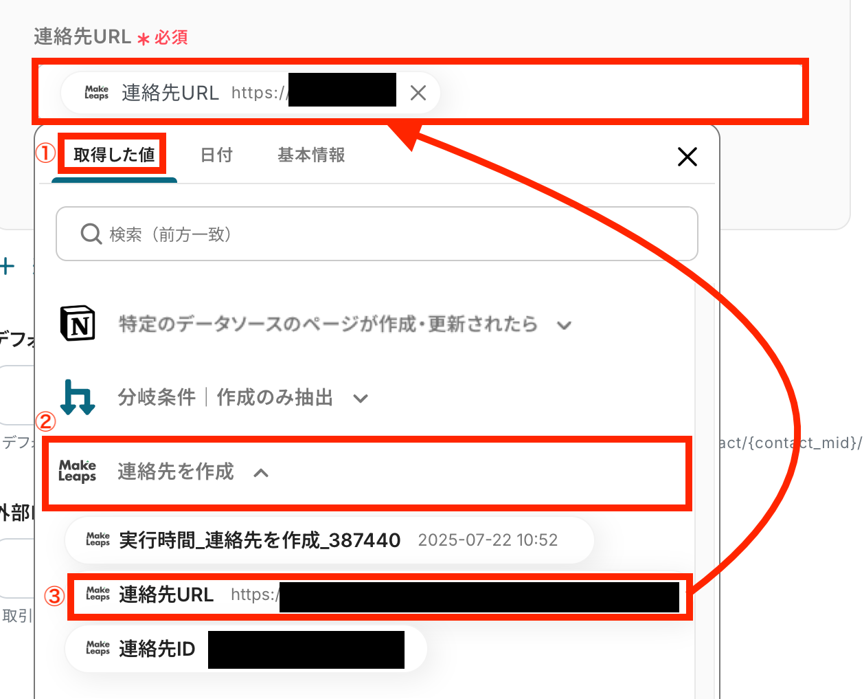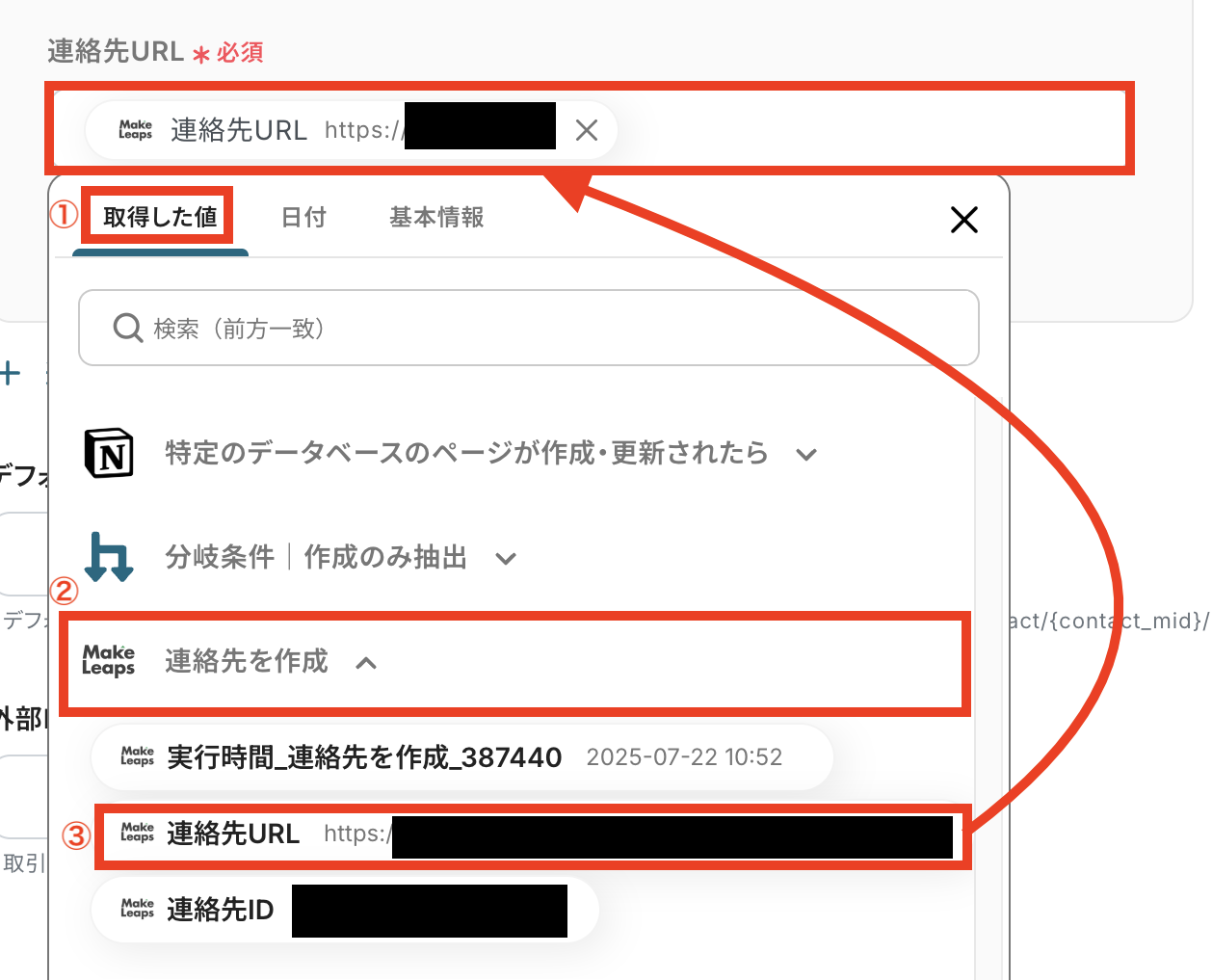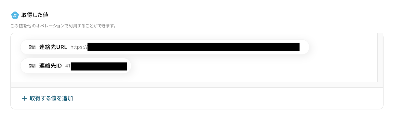 ※現時点では、MakeLeapsのUI上にはまだ表示されません。 アウトプットされた「連絡先ID」を次のステップで取引先として紐付けることで表示されるようになります!(連絡先と取引先の作成はセットで設定する必要があります。)