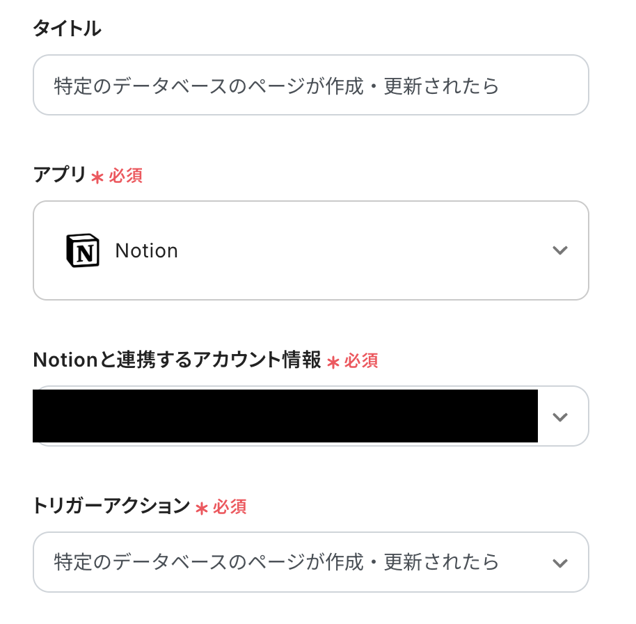 必要箇所を入力していきます。 「タイトル」:必要に応じて変更可能 「Notionと連携するアカウント情報」:合っているか確認 「トリガーアクション」:「特定のデータベースのページが作成・更新されたら」を選択
