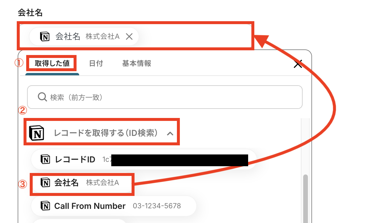 取得したいレコードの条件を画像の通り、ステップ3で取得した値を活用して設定します。