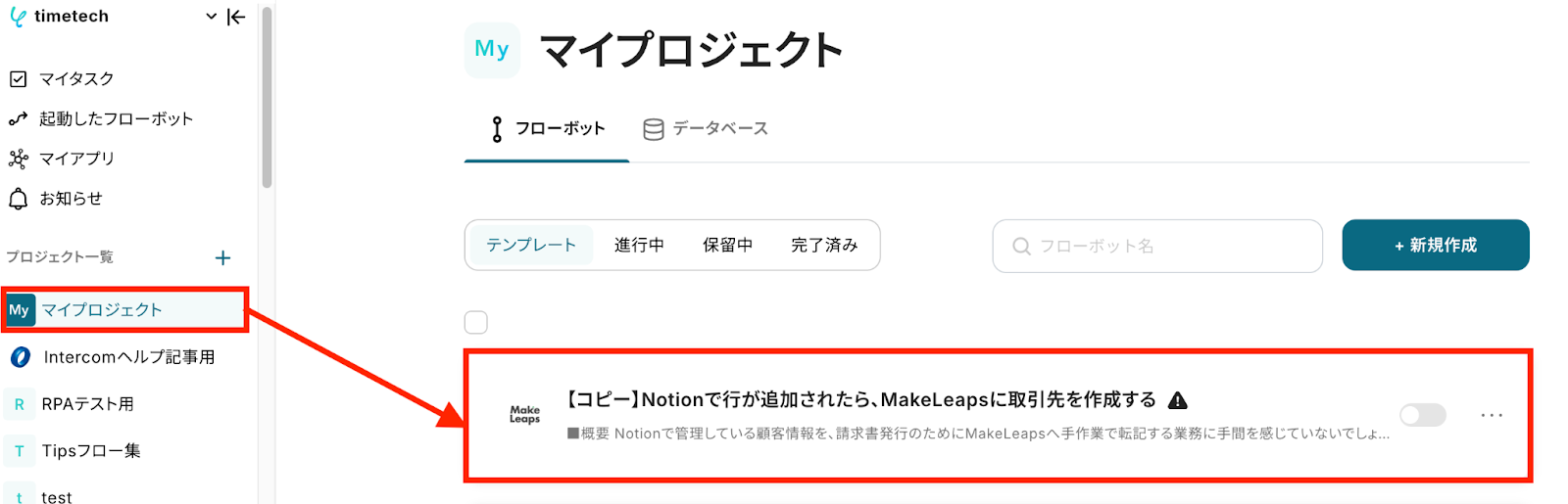今回は「Notionで行が追加されたら、MakeLeapsに取引先を作成する」という実際のフローボットも作成していきます! 作成の流れは大きく分けて以下です。