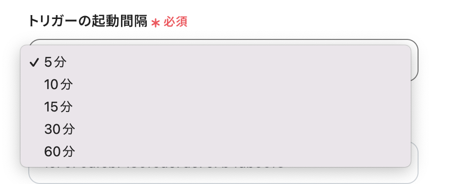 「トリガーの起動間隔」を5分・10分・15分・30分・60分から選択します。 早めにMakeLeapsと連携したい場合は、短い間隔で設定しましょう! ※プラン によって起動間隔の選択内容が異なるため、ご注意ください。