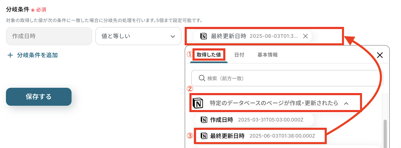 次に「分岐条件」も画像の通り入力します。 入力できたら「保存する」をクリックしましょう。