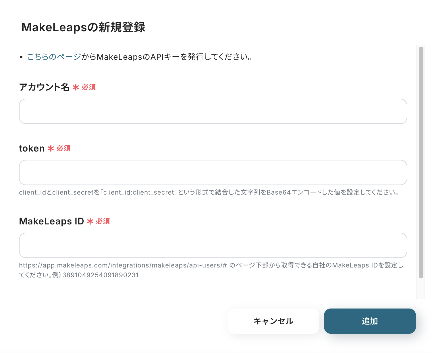 MakeLeapsを検索すると新規登録画面が表示されるので「アカウント名」と「Token」と「MakeLeaps ID」を入力して連携完了です! ※MakeLeapsのAPIキーはこちら から取得してください。