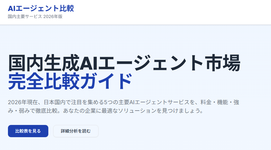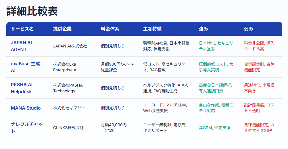 生成AIエージェント市場における主要な競合サービスを5つピックアップし、それぞれの特徴、料金、強み、弱みをまとめた比較表を作成してください。