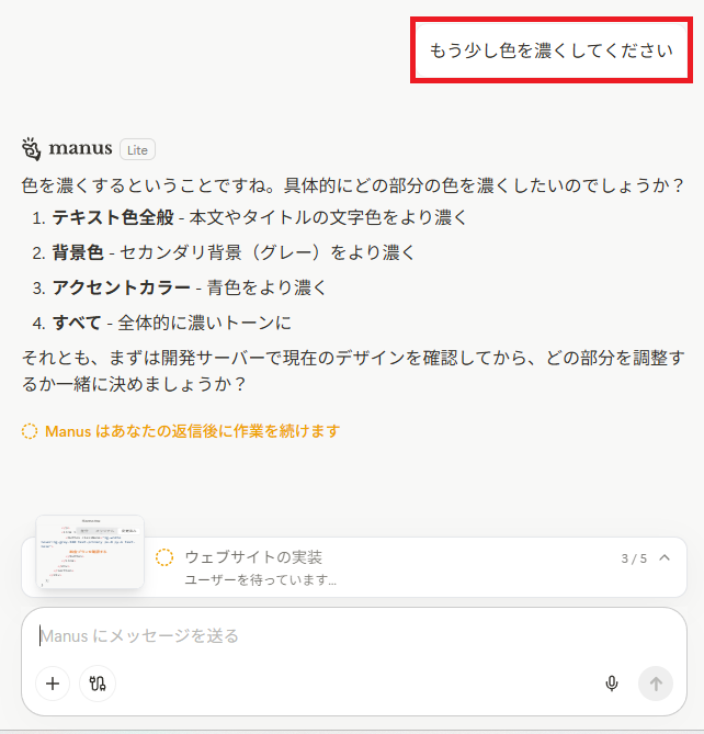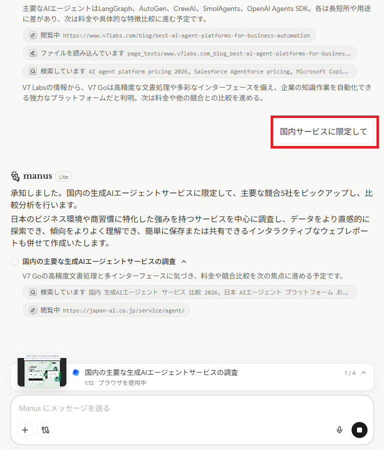 もしManusが誤った方向(例:関係ない業界の調査)に進もうとした場合、ユーザーは途中で「そのサイトは除外して」「国内サービスに限定して」といった追加指示を出し、軌道修正することができます。
