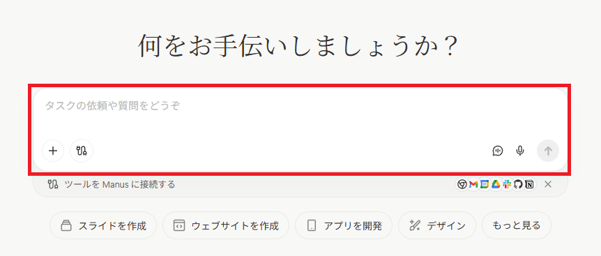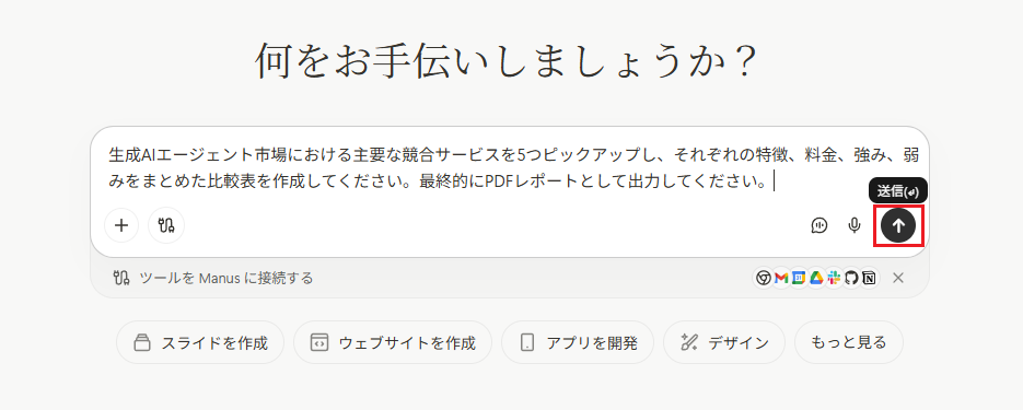 このチャット欄に指示を入力・送信するだけで利用開始できます。