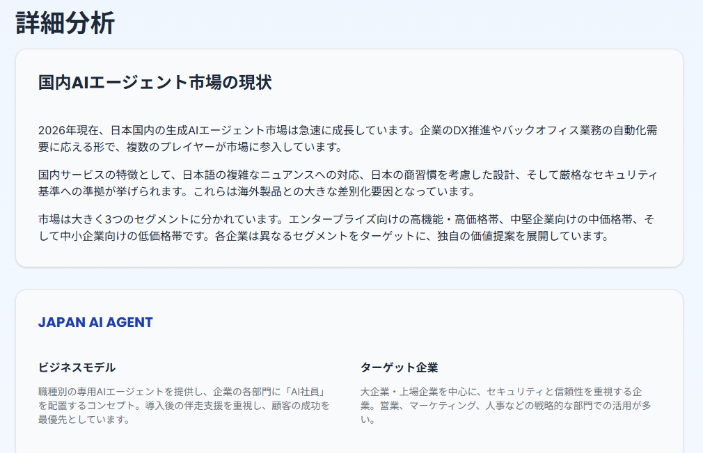 情報を収集するだけでなく、競合比較表やSWOT分析を含んだレポートを作成できるため、人間が数日かけるリサーチ業務を数十分で完了させることが可能です。