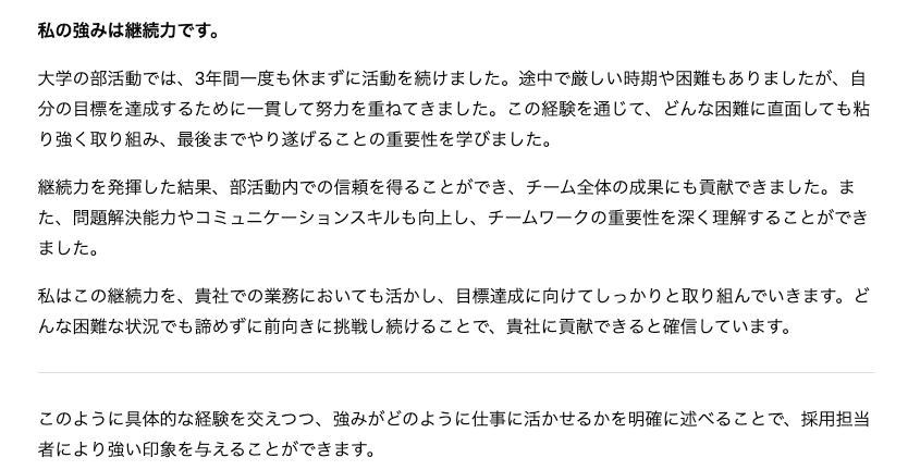 私の長所は継続力です。部活動を3年間一度も休まずに続けました。大変なこともたくさんあったけど、最後までやり遂げました。この経験を仕事でも活かしたいです。