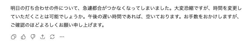 元の文章は「変えてもらえませんか」や「返事ください」といった、ビジネスシーンでは信頼を損ないかねない稚拙な表現でしたが、ChatGPTは文脈を正確に読み取り「変更していただくことは可能でしょうか」や「ご確認のほどよろしくお願い申し上げます」といった、相手への敬意が伝わる適切な敬語へと変換しています。