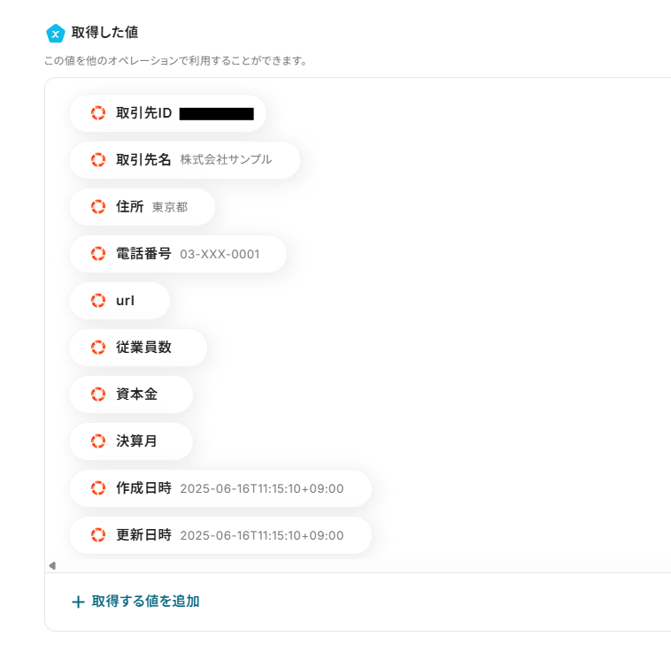 トリガーやオペレーション設定時に、「テスト」を実行して取得した値です。