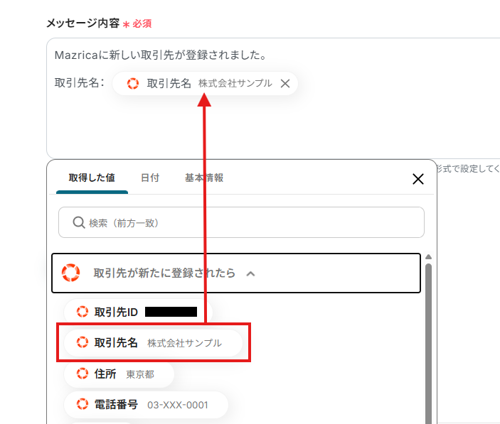 「メッセージ内容」は、入力欄をクリックして表示される取得した値からMazricaの情報を選択できます。