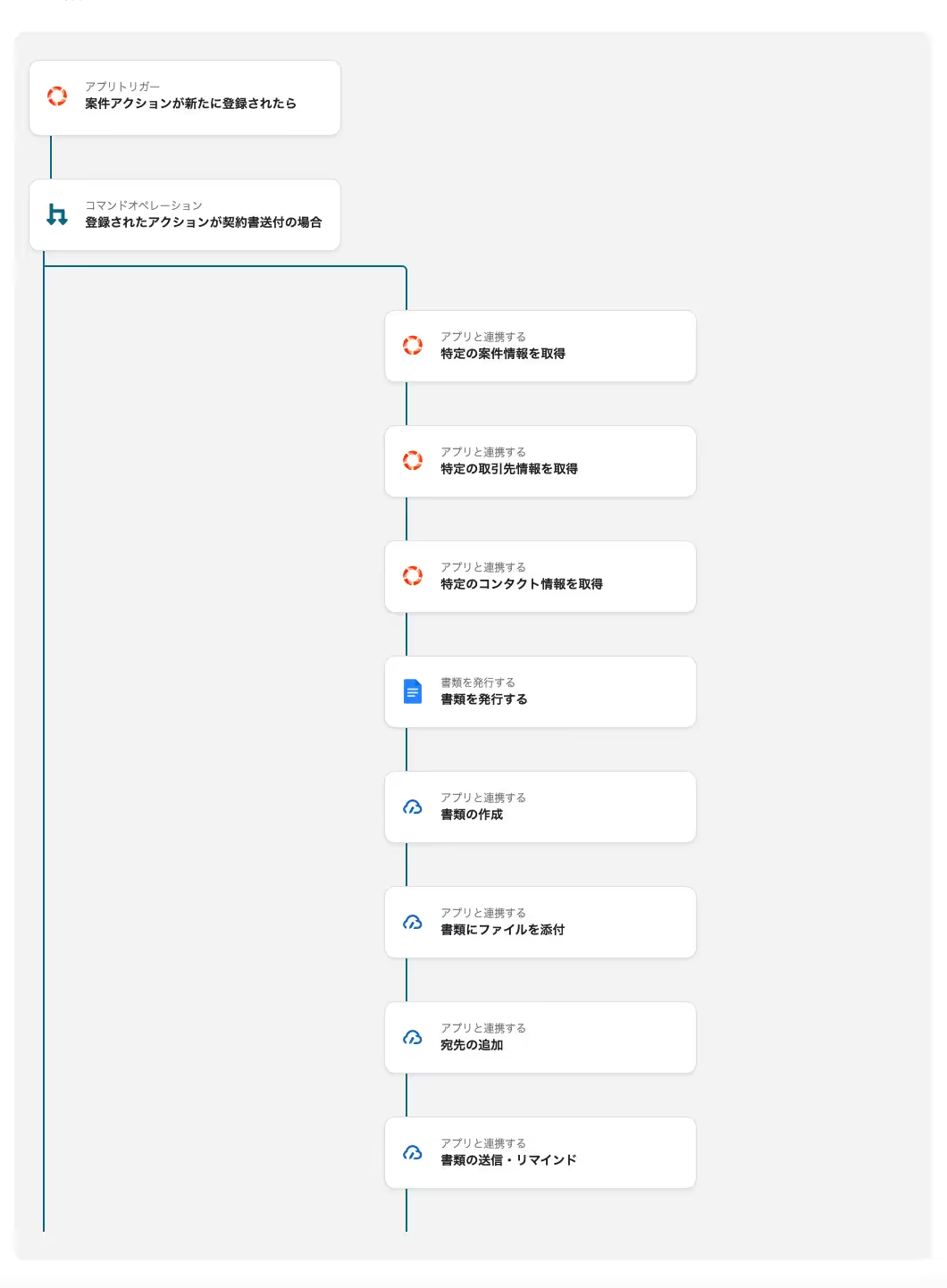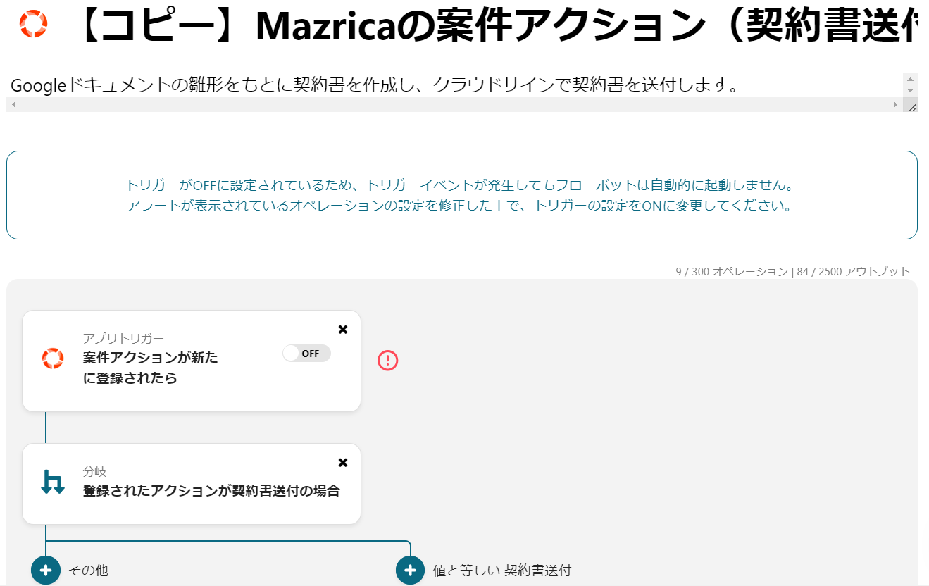 本記事では、「Mazricaの案件アクション(契約書送付)が登録されたら契約書を作成し、クラウドサインで送付する」テンプレートの設定をご紹介します。